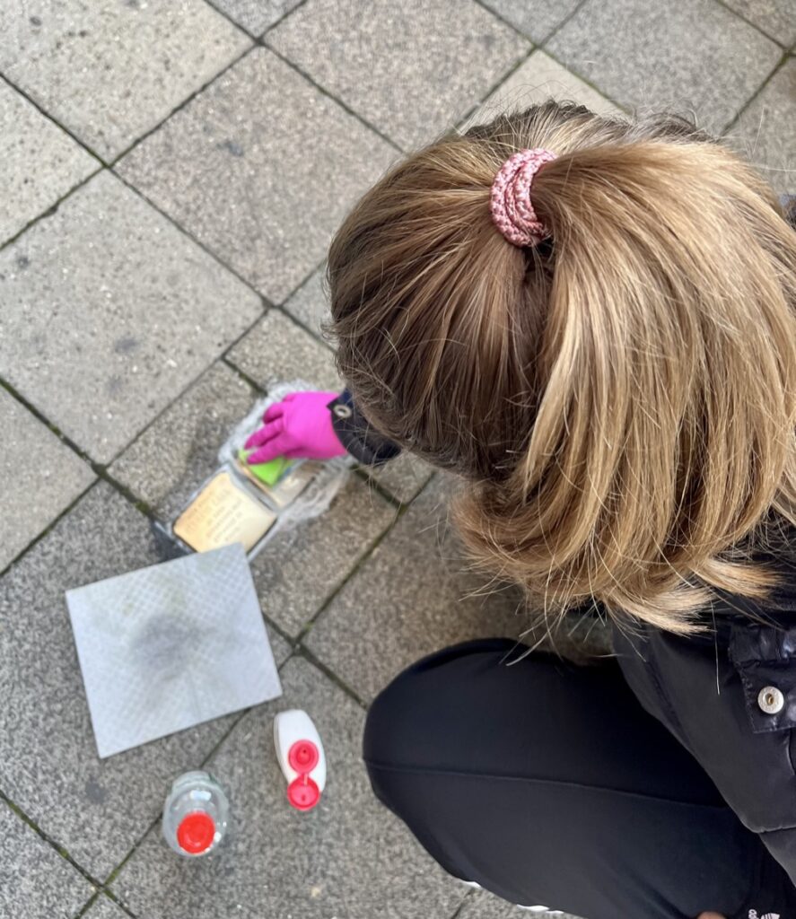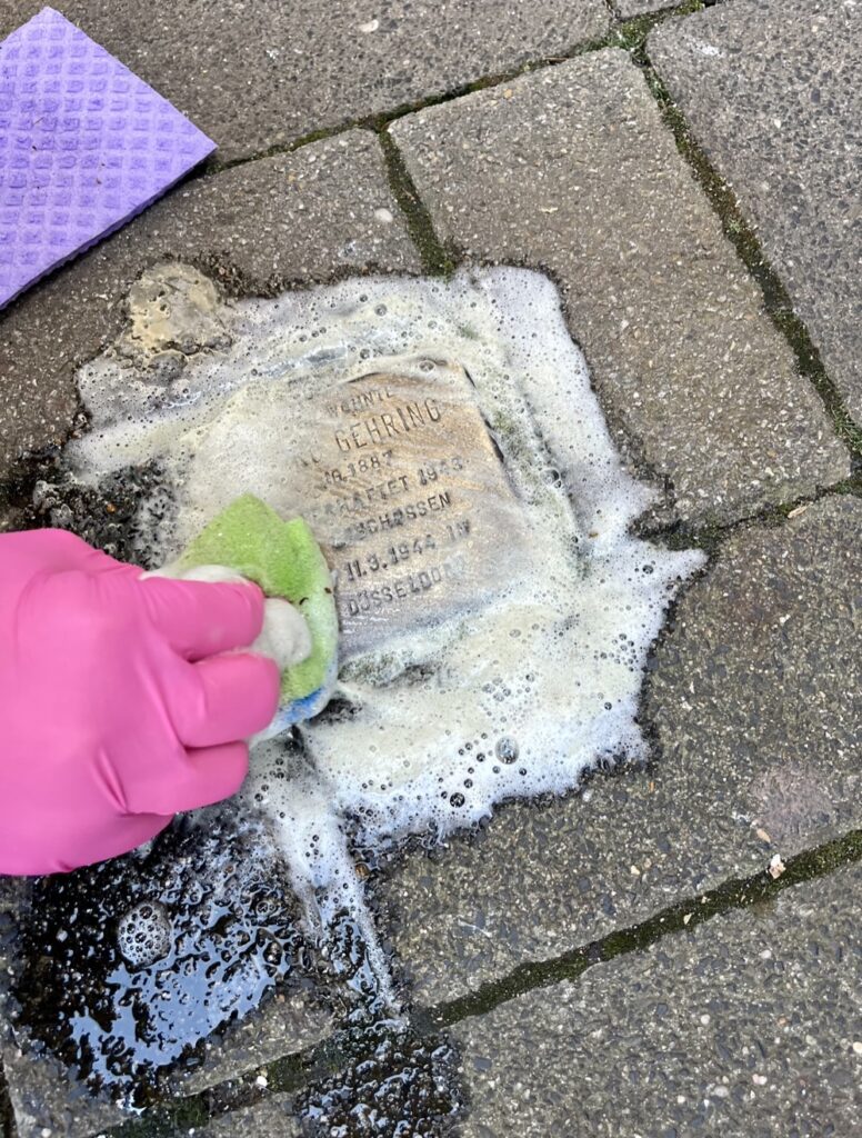 Im Anschluss besuchten die Lernenden die Stolpersteine der zuvor recherchierten Personen im Stadtgebiet. Die Stolpersteine wurden sorgfältig gereinigt, um ein sichtbares Zeichen der Erinnerung und Wertschätzung gegenüber den Opfern des Nationalsozialismus zu setzen.