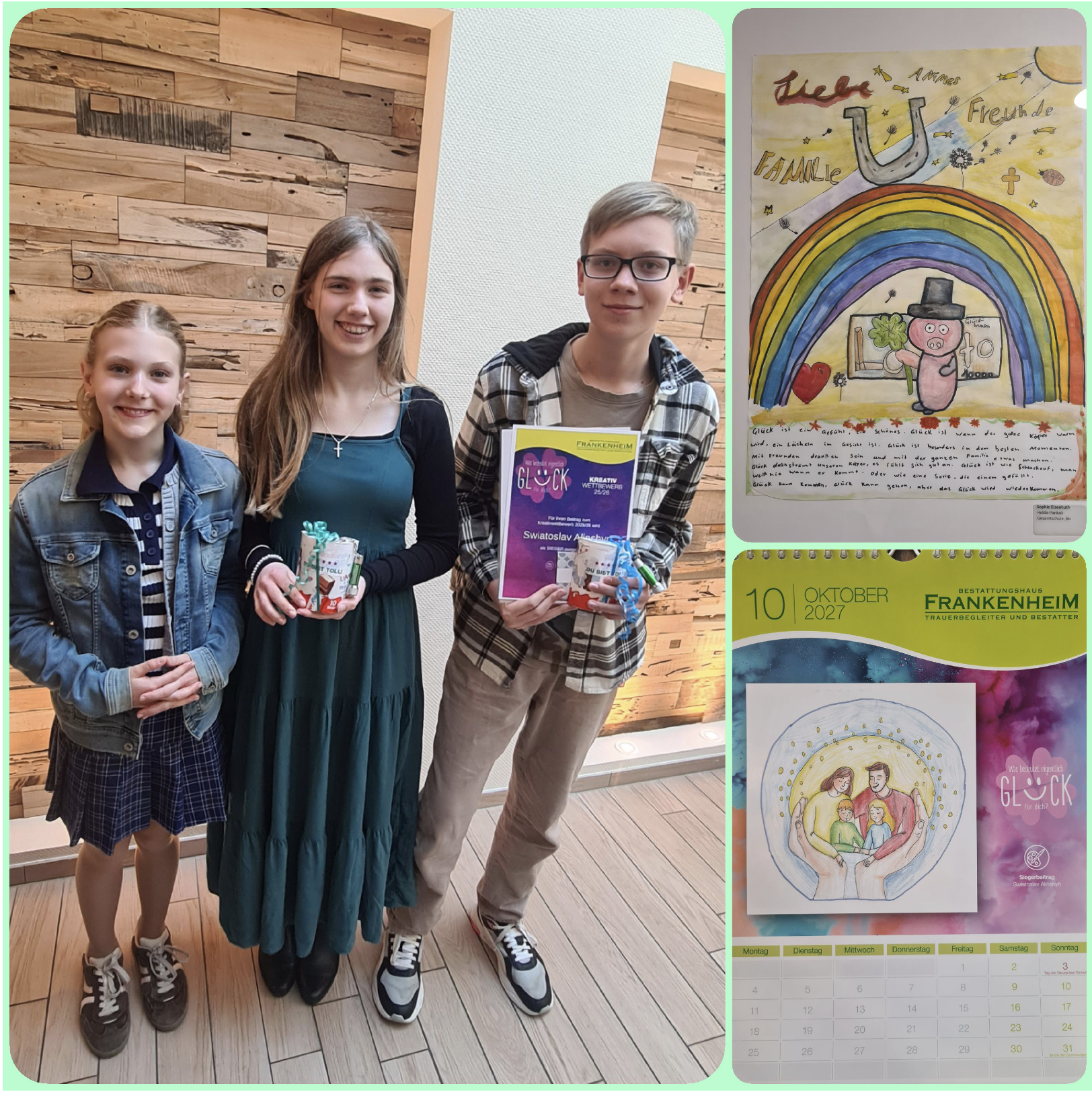 Heraus kam eine Vielfalt an kreativen Glücksvorstellungen, die unter den insgesamt 220 Beiträgen Teil der Ausstellung wurden und ihren Auftakt zur Preisverleihung am 22. März hatte. Besonders erfreulich: Unter den 12 Finalisten ist auch unser Schüler, Sviatoslav, mit seiner künstlerischen Glücksvorstellung – Familie ist alles – geehrt worden. Seine Arbeit wird auch in einem Kalender und im Postkartenformat vervielfältigt gewürdigt. Auch Sophie wurde mit einem Preis für die engere Auswahl geehrt.